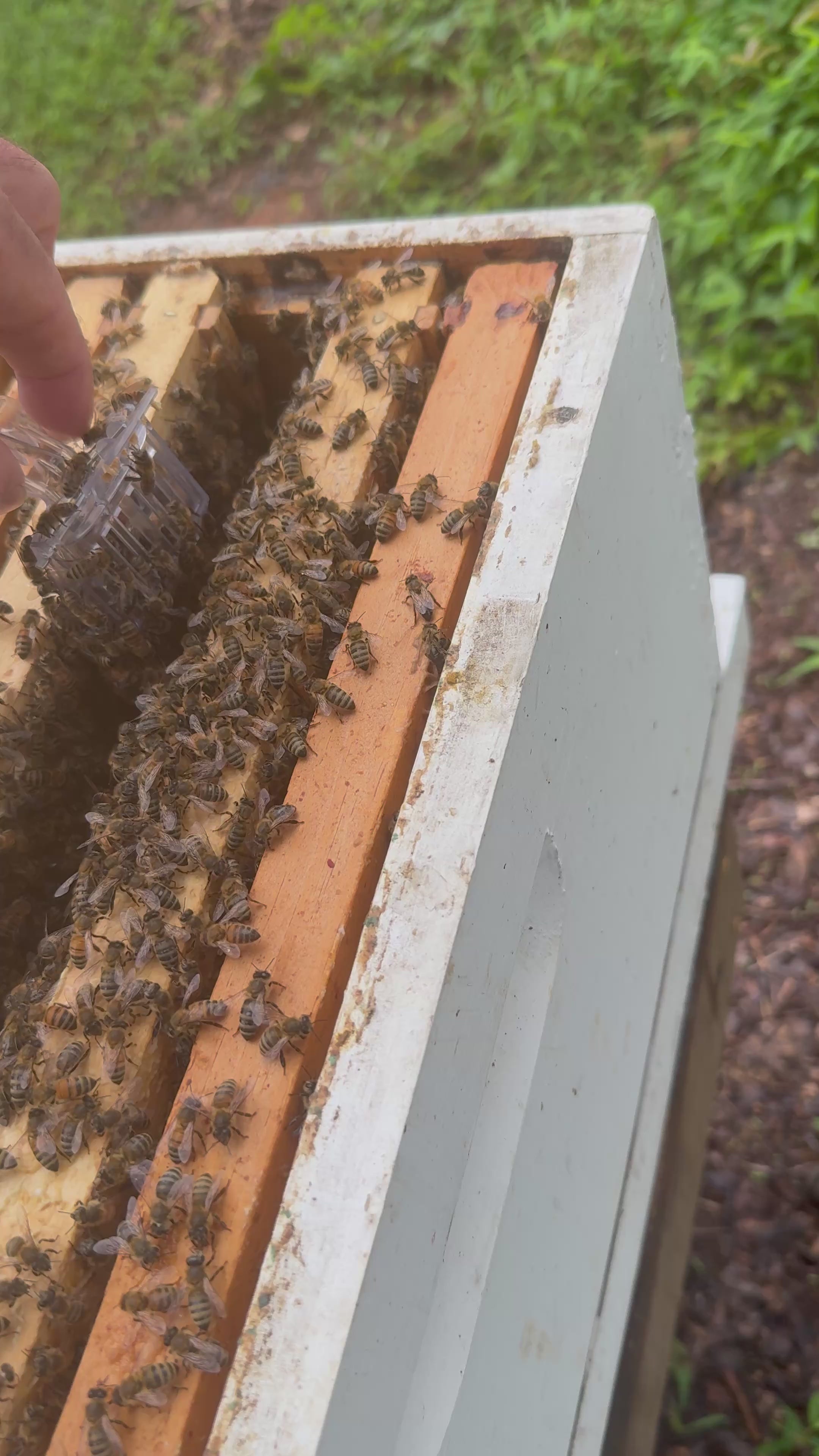 - The cage is placed inside the hive, allowing the colony to smell her pheromones while still keeping her protected.